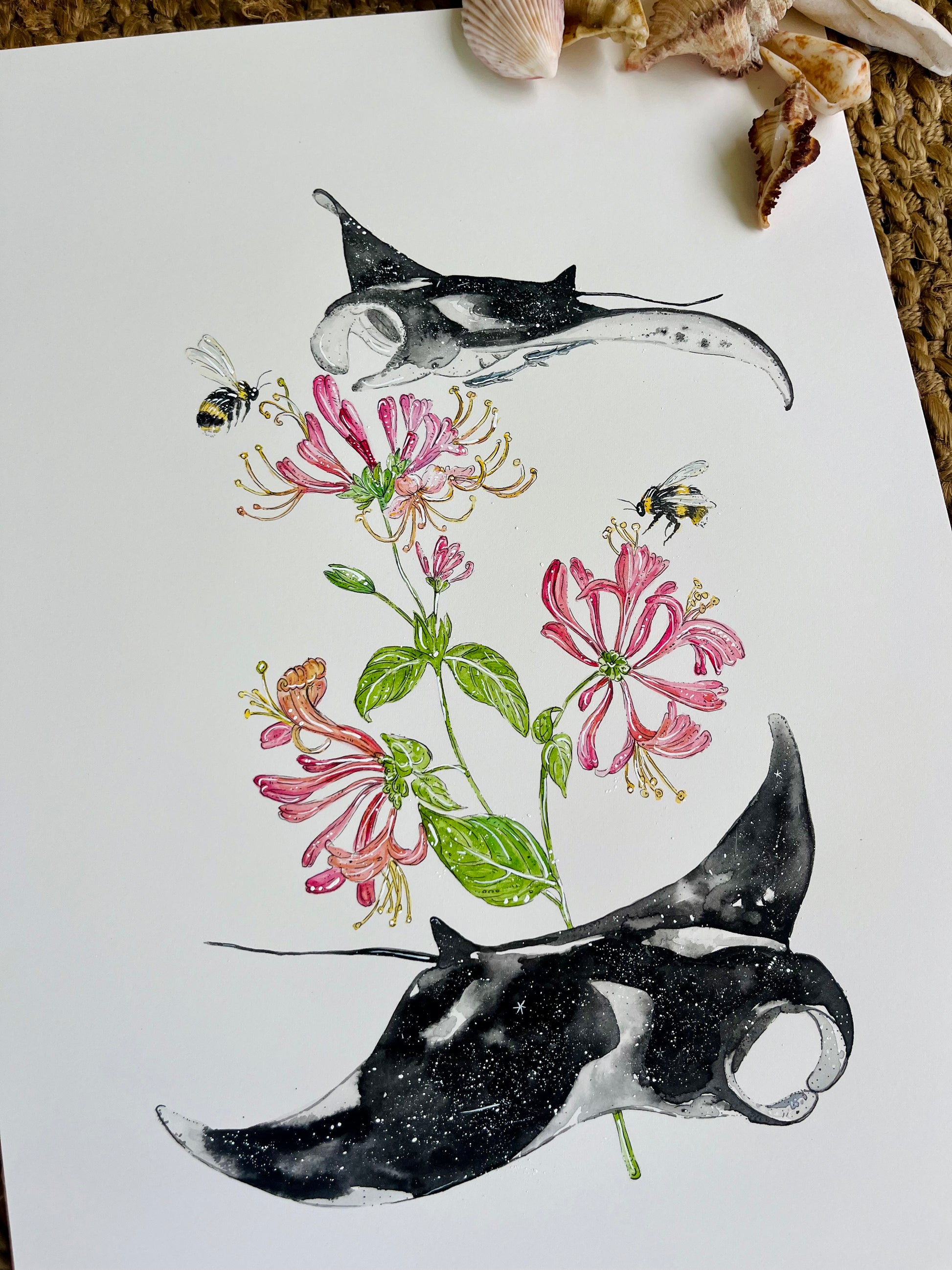 'Natural Abundance' Manta Ray & Honeysuckle | Original Watercolour Artwork