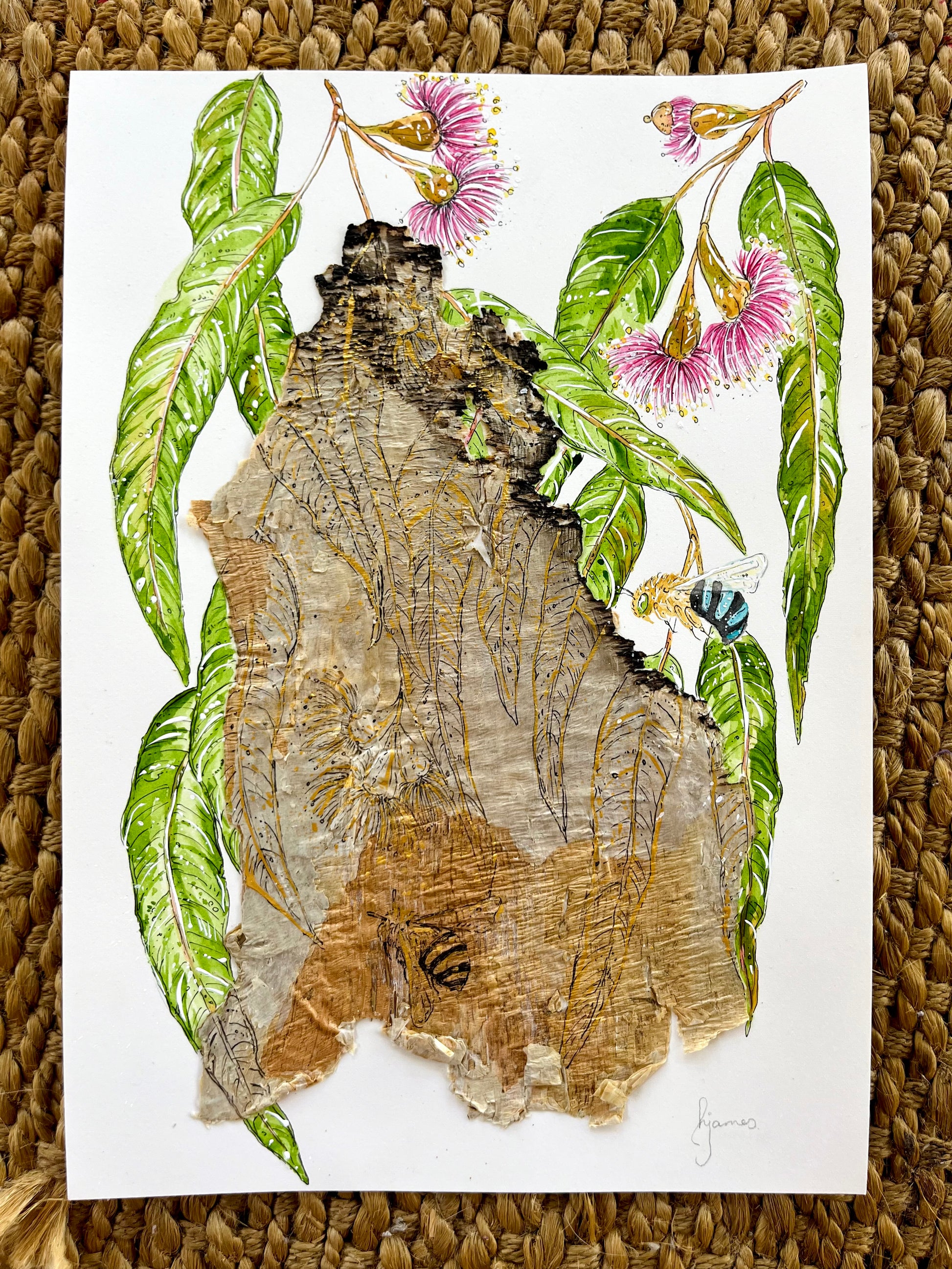 A mixed media original painted with watercolour and ink on archival paper, with bark foraged from the bush and embedded with fine golden line work.