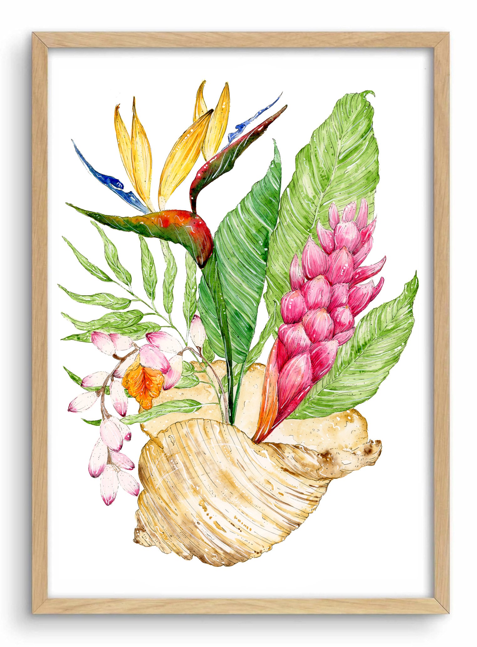 A vibrant bouquet of ginger lily, bird of paradise, and shell ginger lilies in a sea shell vase.