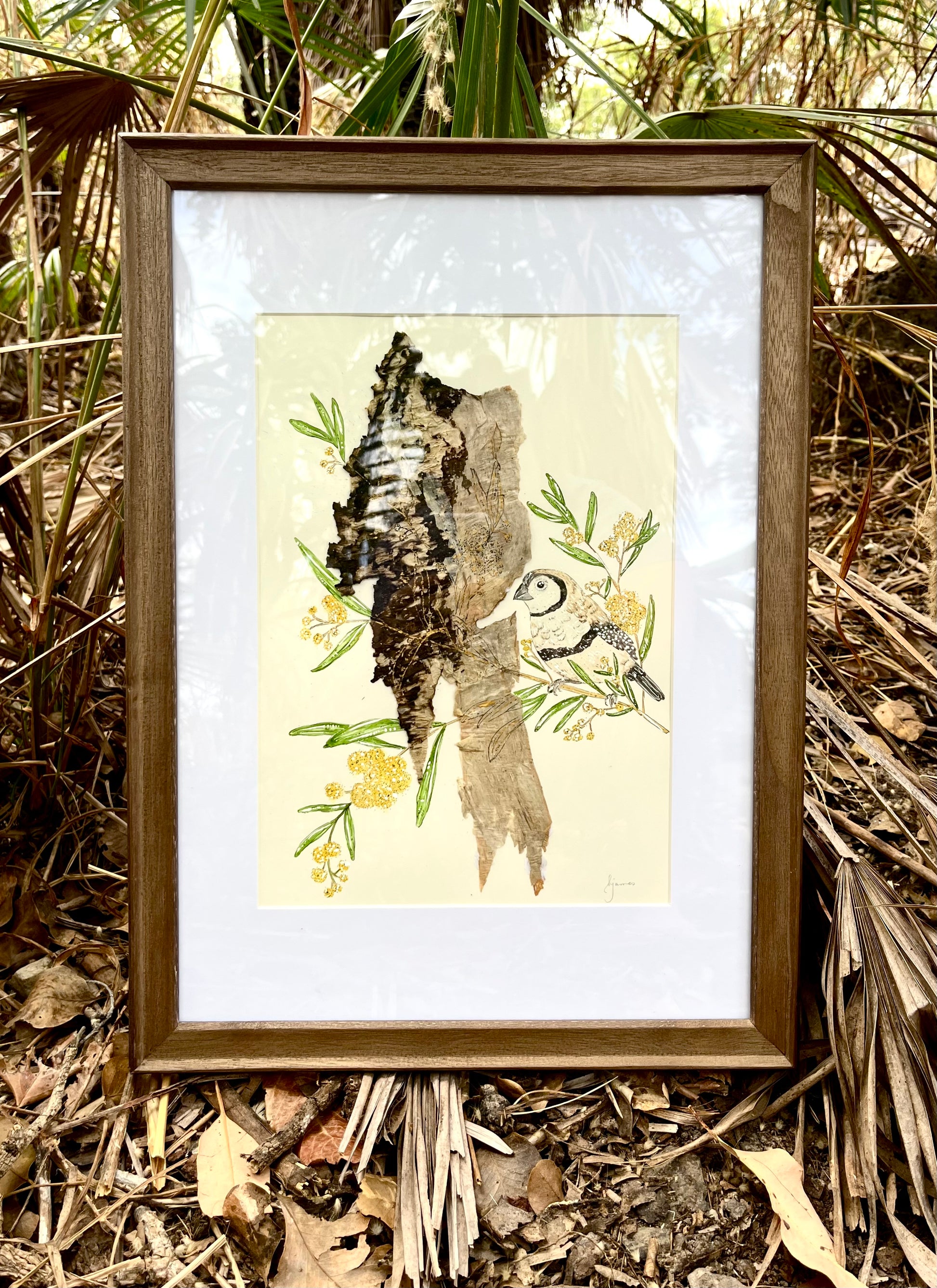 Introducing "Whispers in the Wattle", a delicate blend of real Australian paperbark, hand-painted golden wattle, and a sweet double-barred finch. This piece celebrates the quiet poetry of the bush and the beauty found in natural textures and gentle detail.